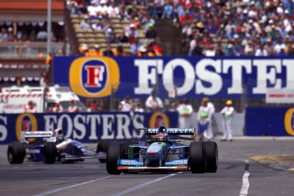 Arrivé en Australie avec un seul point d’avance sur son rival Hill, Michael Schumacher craque sous la pression du Britannique dans le 35ème tour de course. Revenu en piste après avoir frappé le mur de béton, l’Allemand accroche grossièrement le pilote Williams et coiffe dans la controverse son premier titre de champion du monde.